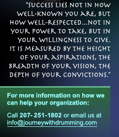 At the heart of any organization is the individual and the connections and decision making they share with others daily. When the connection to yourself is healthy and happy, then it will also be with others around you and your organization. Corporate America is becoming empowered and the spirit of business is being restored by "the beat of the drum". When you are lacking direction, feeling challenged or unsuccessful, where do you attain your answers? There is much wisdom within the many states of our "being" waiting to be experienced. Assisting you along your journey, our goal is to create an experience that teaches you the tools to de-stress and grow yourself. Creating a more worthwhile individual from within, which builds a more harmonious and creative organization.